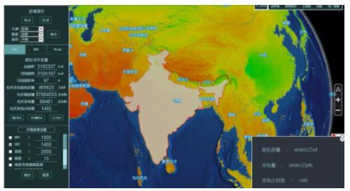 该系统归集了全球风能10×10公里、测风高度70米、80米、100米的十年逐小时风能资源数据,以及太阳能4×4公里的十年平均太阳能辐射量数据,可实现对全球重点风光发电基地开发潜力和出力特性的评估,并基于三维GIS工具实现风光发电基地资源评估和出力特性的可视化展示。