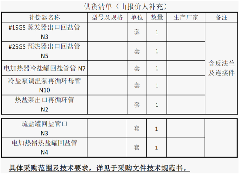 报价人应确保供货范围完整,以能满足用户安装、运行要求为原则,在技术规范中涉及的供货要求也作为本供货范围的补充,若在安装、调试、运行中发现缺项(属报价人供货范围)由报价人免费补充,对于表中熔盐补偿器安全稳定运行所必须的设备,报价人也应负责提供。