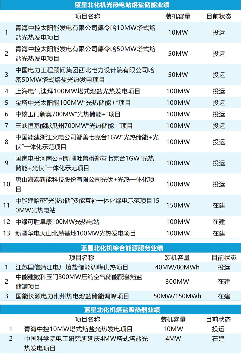 截至2025 年5月,蓝星北化机交付及在建的熔盐储热总容量已达24.2GWh。技术实力不仅通过国内首座商业化运行的青海中控10MW光热项目(稳定运行9年)得到验证,更在“一带一路”重点工程——迪拜100MW光热项目中展现国际竞争力。公司主要业绩如下: