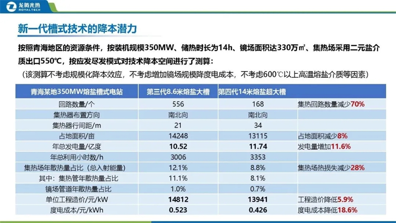 采用第三代槽式光热技术的电站投资较第二代槽式技术将大幅下降,同时发电效率将进一步提高,从而实现度电成本的显著下降,同时保持了槽式技术一贯的光电效率高、镜场占地小、运行稳定、爬坡期短、达产率高、高气候适应、易检修维护等一系列优点。