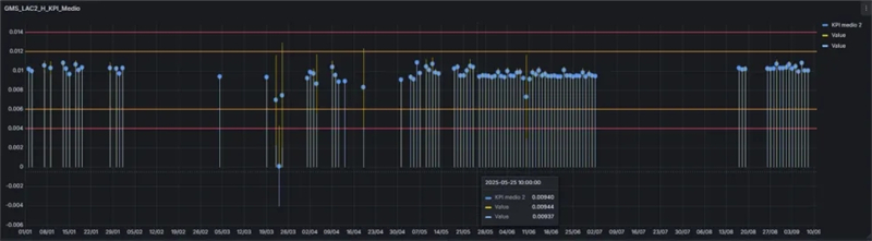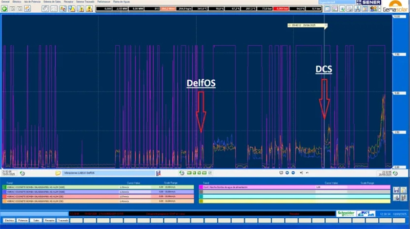 例图说明:在给水泵三通阀故障检测案例中,Exera通过分析各振动测点的平均KPI趋势及其算法生成的瞬时KPI,成功识别出异常。从DCS系统截图中可见,其于2025年4月29日才检测到异常模式,而DelfOS平台提前1个月零10天就已识别。这一时间差直接决定了此次维修是小修干预、大修干预或是面临灾难性故障。