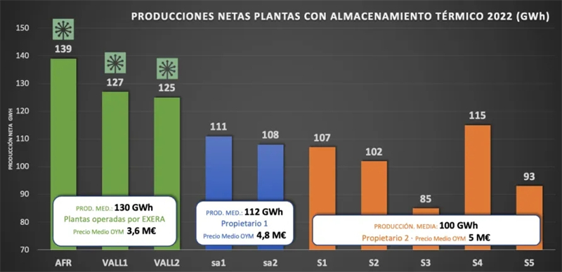 例图说明:左侧绿色柱图为Exera运维的3座光热电站AFR、VALL1、VALL2的发电量