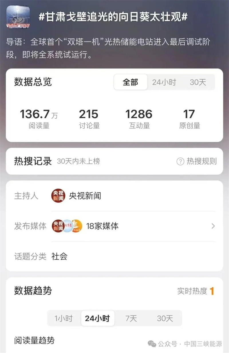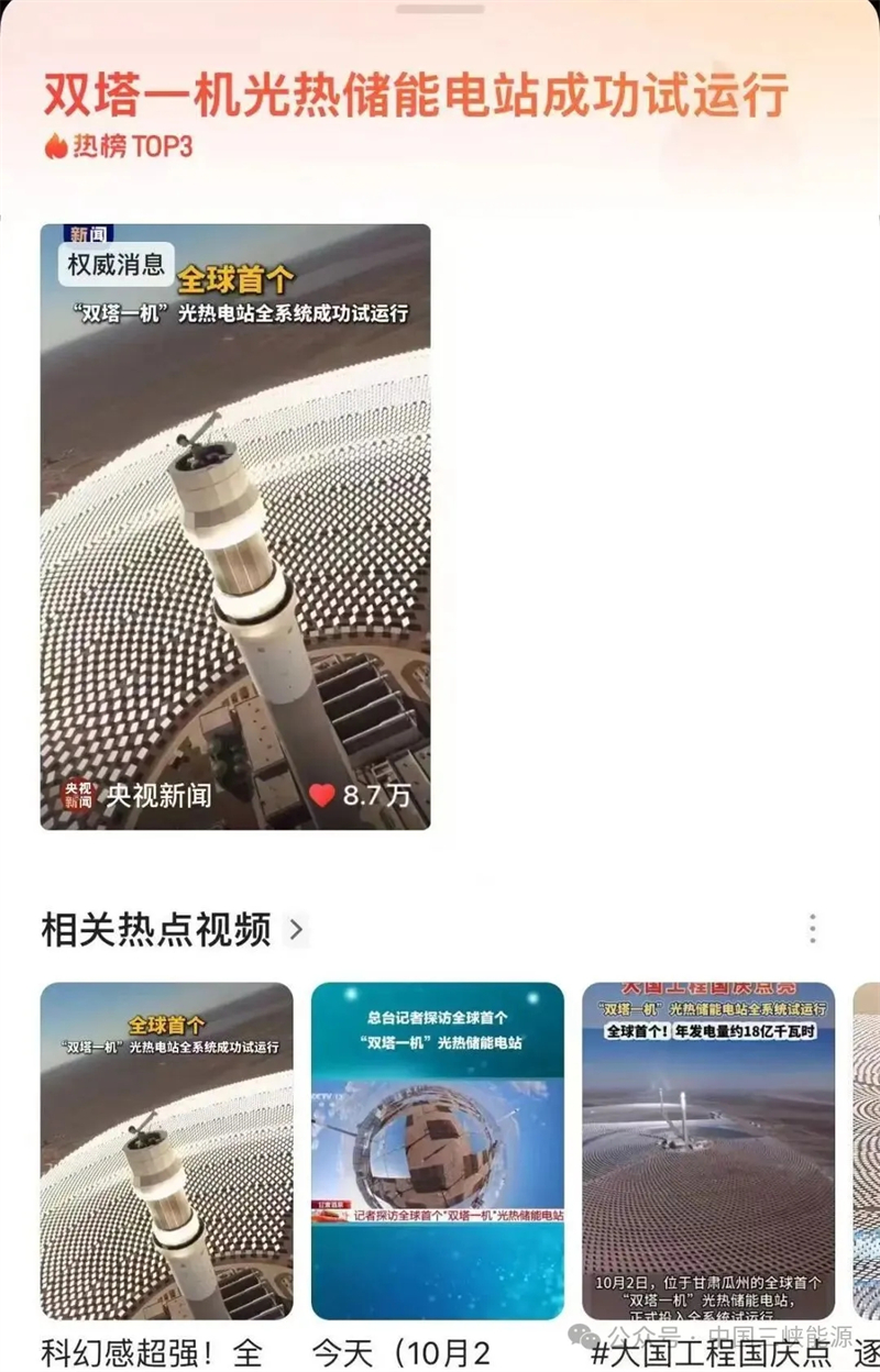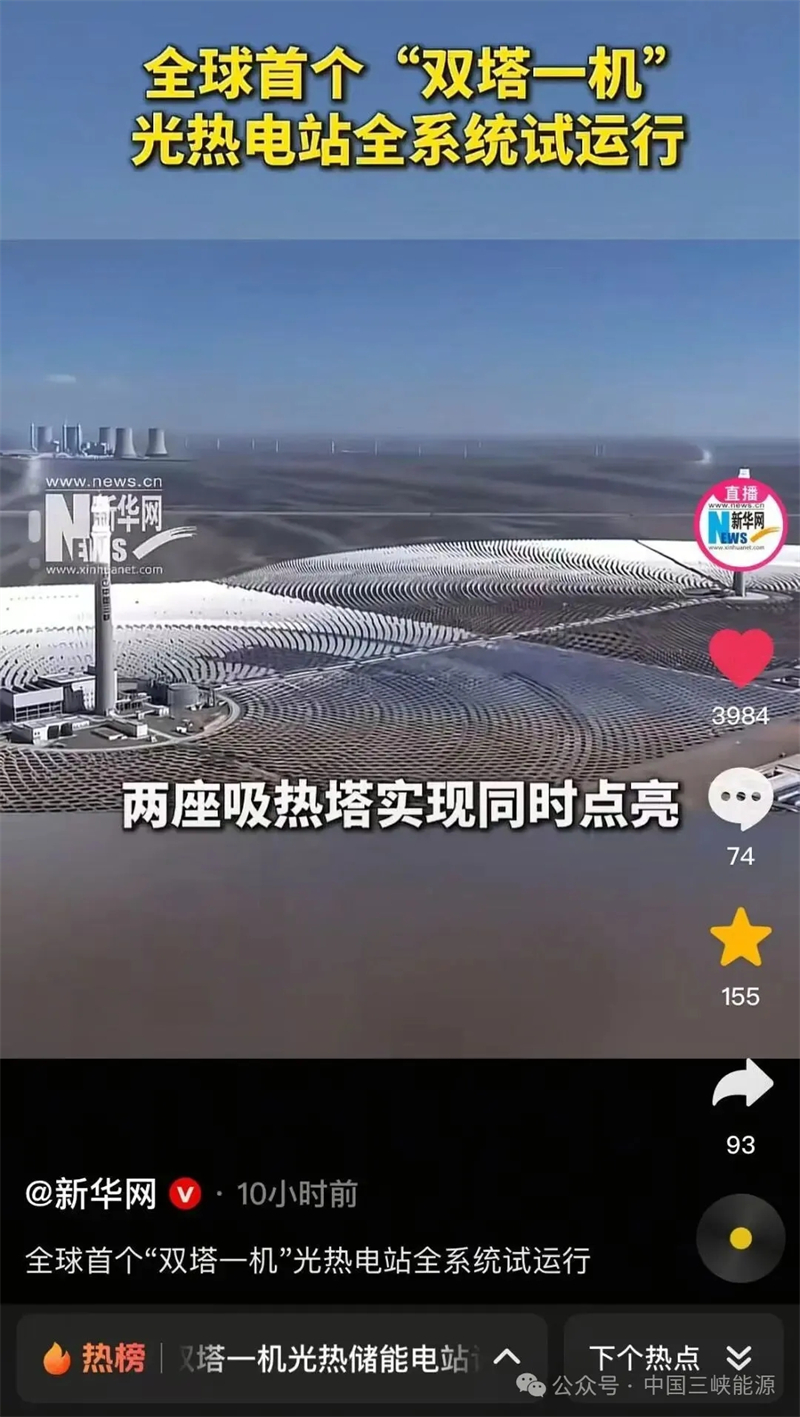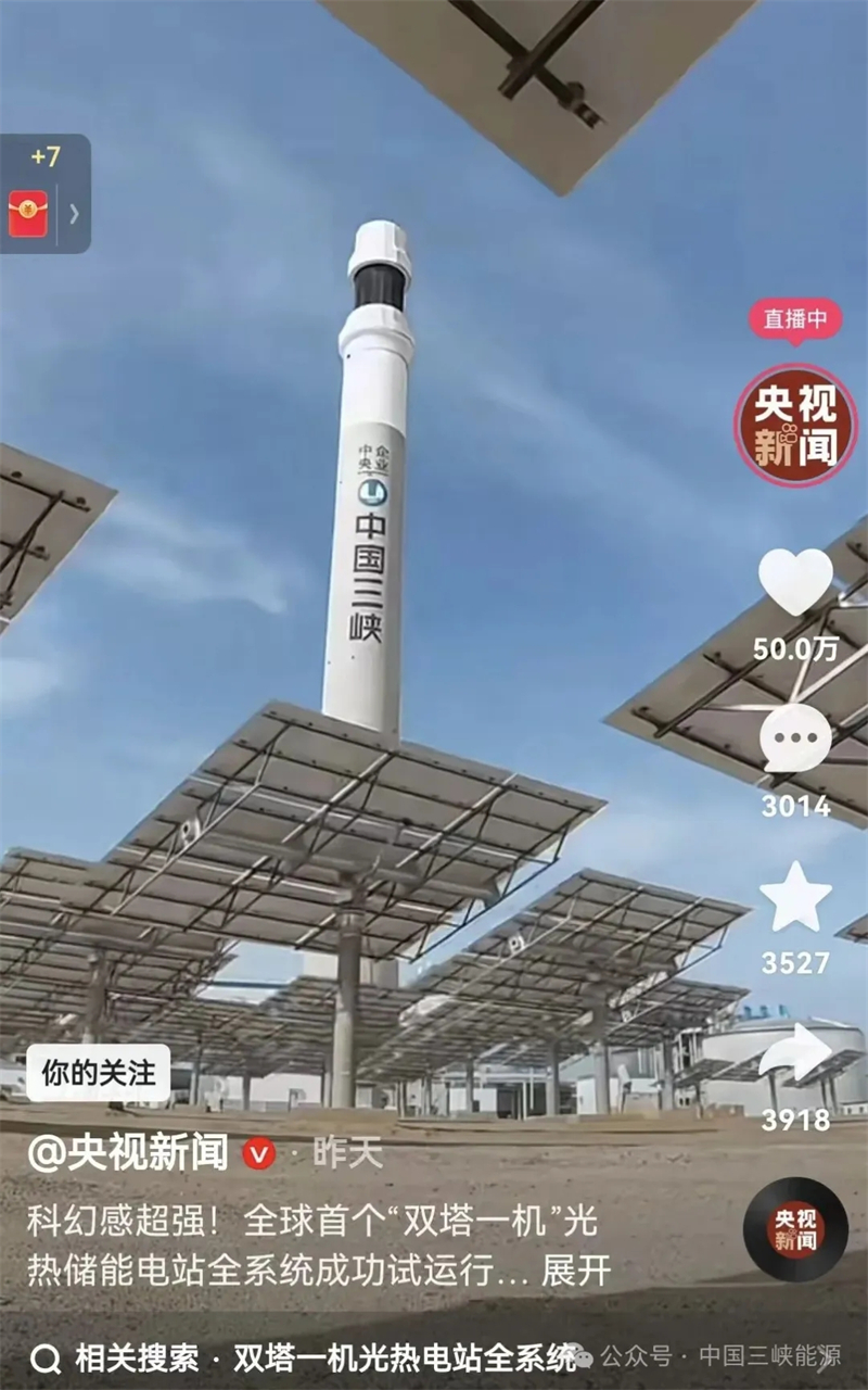 10月2日,甘肃瓜州“双塔一机”光热储能电站完成最后调试,受到中央广播电视总台、科技日报、人民网、新华网、中国能源报等央媒、行业媒体及地方媒体报道。央视新闻频道《新闻联播》《朝闻天下》《新闻直播间》不同时段对瓜州光热储能电站进行直播报道,登上微博、抖音、快手热搜。