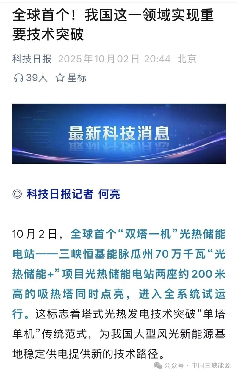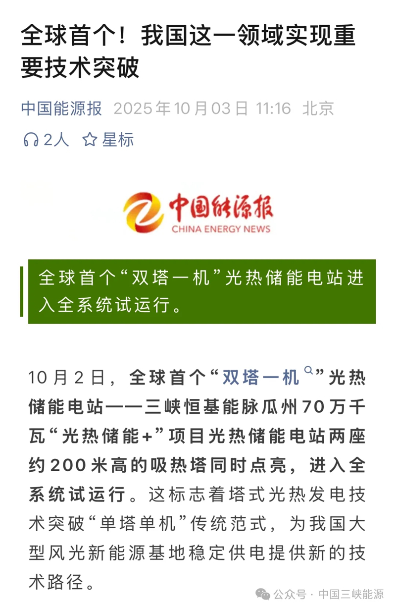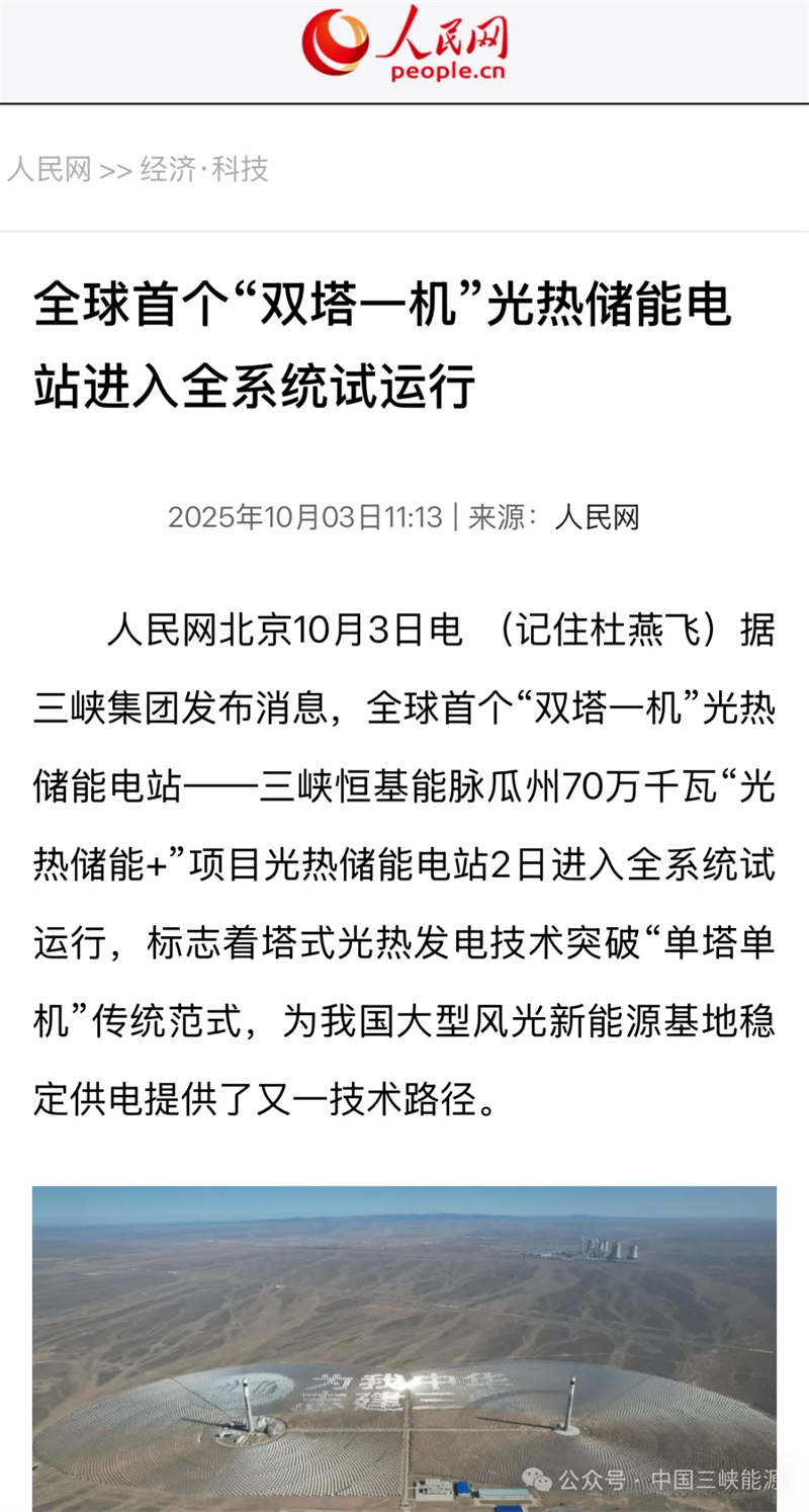 10月2日,甘肃瓜州“双塔一机”光热储能电站完成最后调试,受到中央广播电视总台、科技日报、人民网、新华网、中国能源报等央媒、行业媒体及地方媒体报道。央视新闻频道《新闻联播》《朝闻天下》《新闻直播间》不同时段对瓜州光热储能电站进行直播报道,登上微博、抖音、快手热搜。