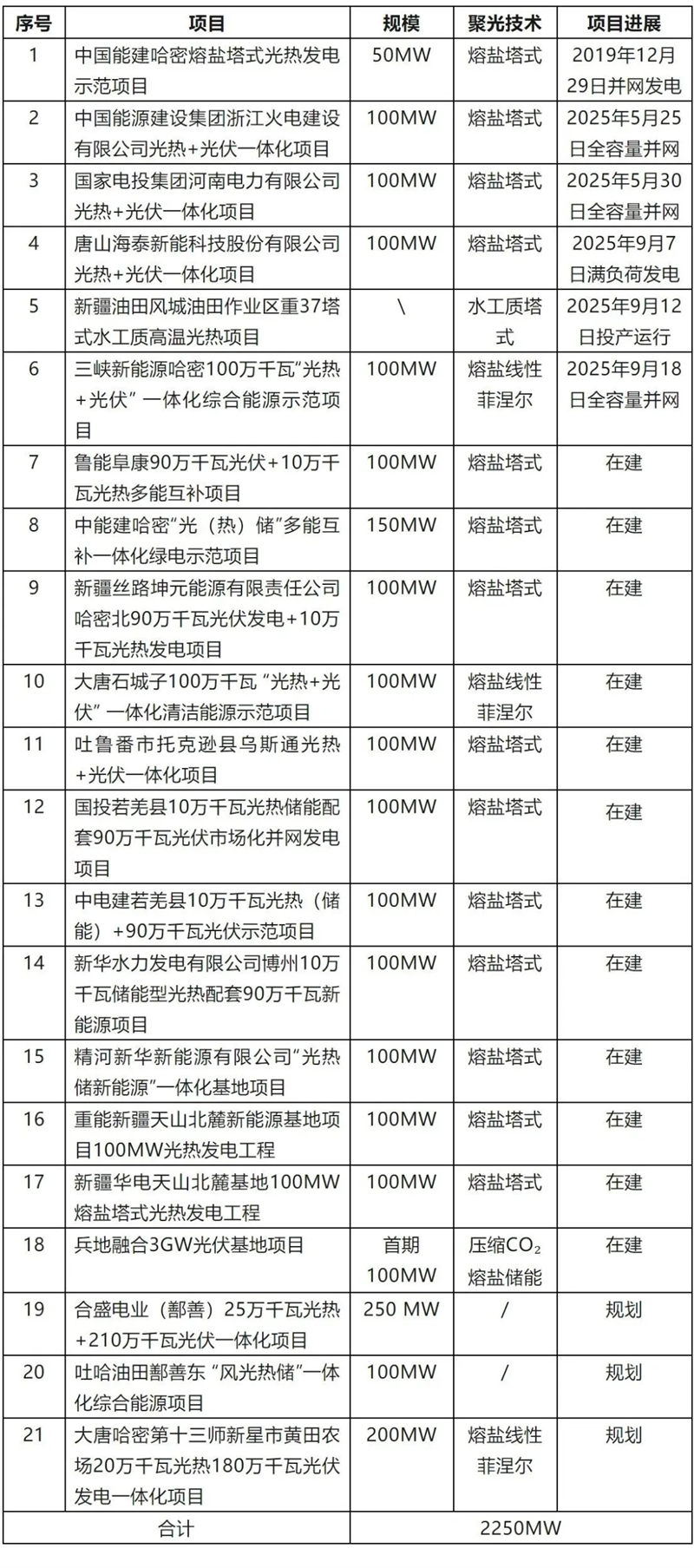 此后短短6年,新疆光热产业按下加速键。据太阳能光热联盟不完全统计,截至 2025年9月,新疆已建成/并网的光热项目有6个(含一座超稠油开采光热利用项目),在建项目12个,规划项目3个,总装机容量突破2250MW。