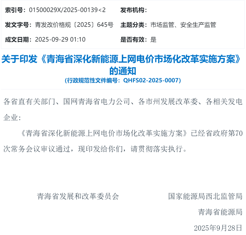 近日,青海省发展和改革委员会、国家能源局西北监管局、青海省能源局联合印发《青海省深化新能源上网电价市场化改革实施方案》的通知。