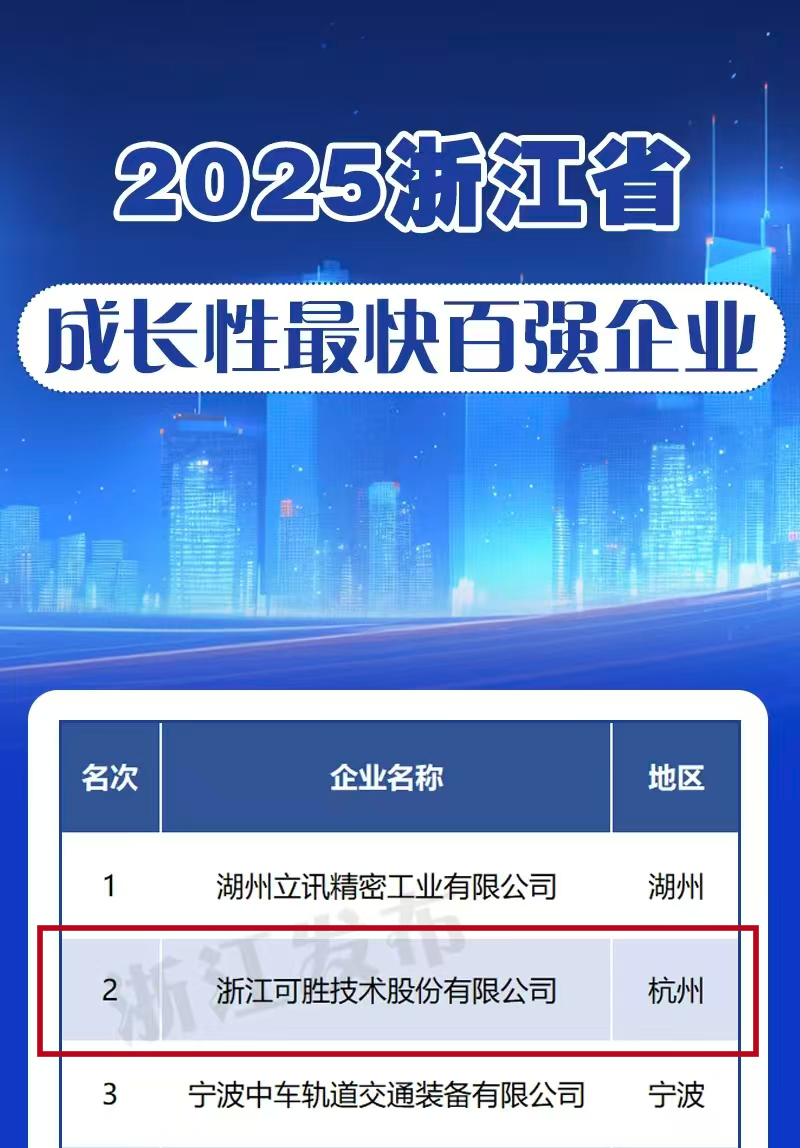 10月15日,浙江省企业联合会、浙江省企业家协会、浙江省工业经济联合会联合正式发布2025浙江省百强企业系列名单。中国可再生能源学会太阳能热发电专委会副主任委员单位——浙江可胜技术股份有限公司(简称:可胜技术)凭借优异的业绩表现与创新实力,荣登“2025浙江省成长性最快百强企业”榜单第2位。