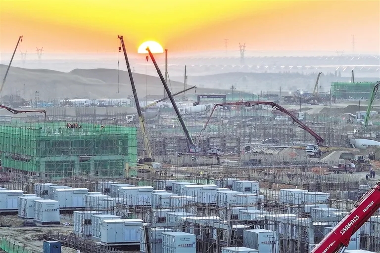 10月16日,在鄂尔多斯市达拉特旗境内的库布其沙漠腹地,谷山梁3GW/12.8GWh储能电站项目工地施工正酣。