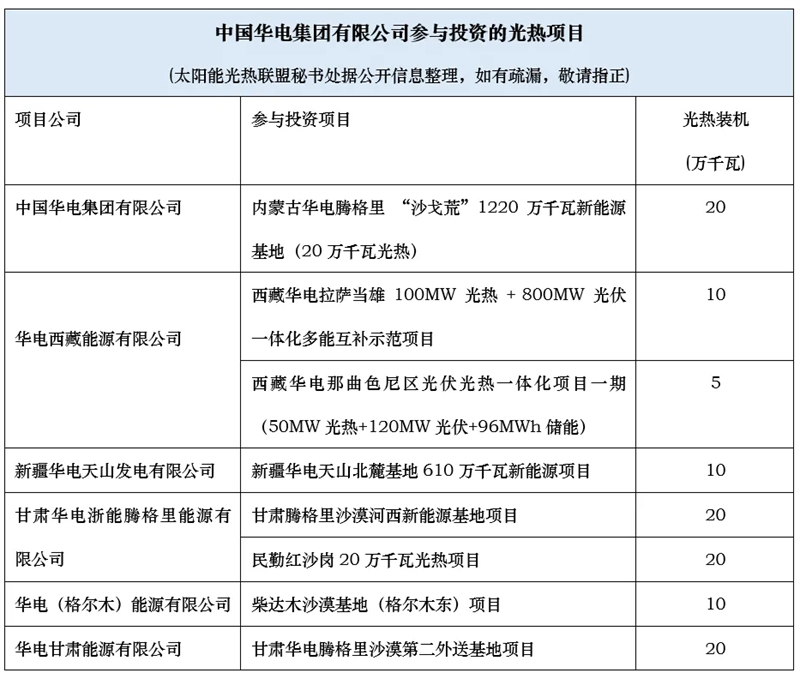 中国华电集团有限公司成立于2002年12月29日,是中央直管的国有重要骨干企业,是中国光热发电的重要参与者。其下属参与光热业务的企业主要有:华电西藏能源有限公司和华电新能源集团股份有限公司(包括:华电甘肃能源有限公司、甘肃华电新能源腾格里能源有限公司、新疆华电天山发电有限公司),参与投资的光热项目主要有: