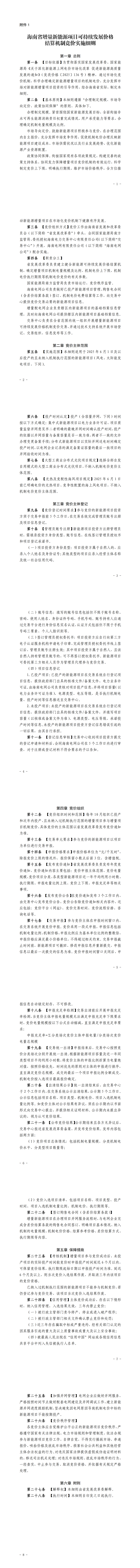 《海南省增量新能源项目可持续发展价格结算机制竞价实施细则》提到,适用于2025年6月1日及以后投产的且未纳入机制执行范围的新能源项目(风电、太阳能发电项目,下同)。