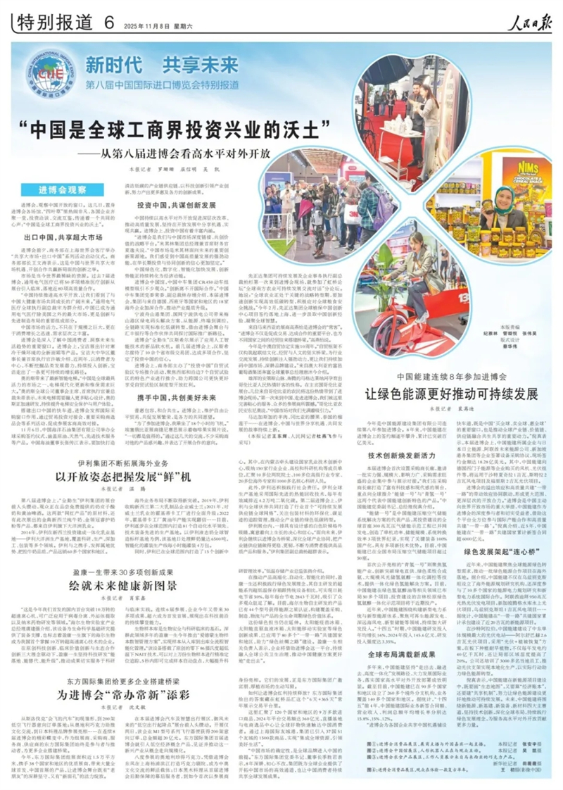 11月8日,《人民日报》“新时代 共享未来”——第八届中国国际进口博览会特别报道,刊发《中国能建连续8年参加进博会 让绿色能源更好推动可持续发展》,深度报道中国能建作为中央企业,坚决贯彻习近平主席关于“将进口博览会越办越好”的重要指示要求,在国务院国资委统筹安排下,连续8年积极参加进博会,全面融入国际产能合作,更好地服务高水平对外开放的生动实践。