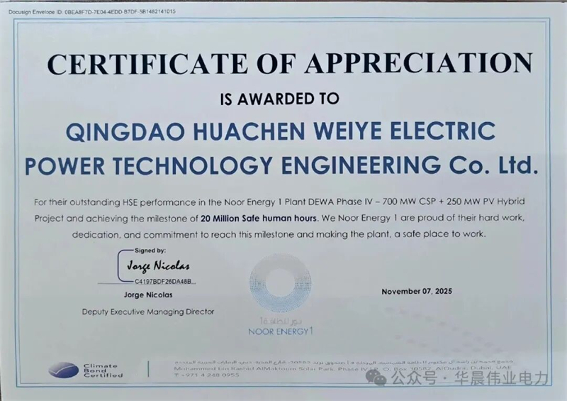 据太阳能光热联盟理事单位——青岛华晨伟业电力科技工程有限公司(简称:华晨伟业)消息,近日,华晨伟业参与的阿联酋迪拜马克图姆太阳能园区四期光热项目荣获项目方Noor Energy 1颁发的两项表彰证书,嘉奖公司和员工在项目健康、安全与环境(HSE)中的杰出表现及关键节点的推进贡献,这是该项目对中国企业及员工专业能力与责任担当的高度认可。