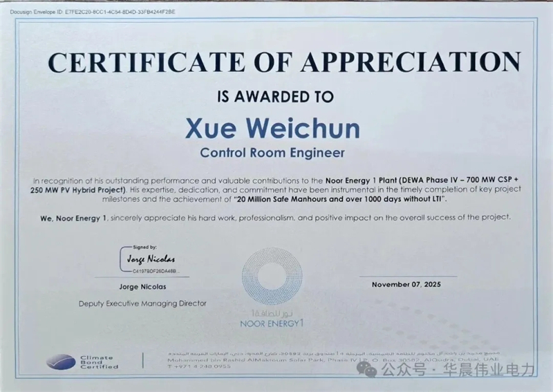 华晨伟业作为该项目重要服务商,凭借专业负责的态度以及精湛的技术能力,获得了项目方Noor Energy 1的高度认可。表彰证书中说到:“华晨伟业卓越的HSE表现,成功达成2000万安全工时里程碑。他们的辛勤工作、奉献精神及对安全目标的承诺,为项目现场打造了安全的工作环境,Noor Energy 1对此表示自豪。”同时,Noor Energy 1也对公司员工薛伟春表示了高度赞扬:“他的专业知识、敬业精神和投入精神对于及时完成关键项目里程碑以及实现‘2000万安全工时和超过1000天无重大事故’起到了重要作用”。