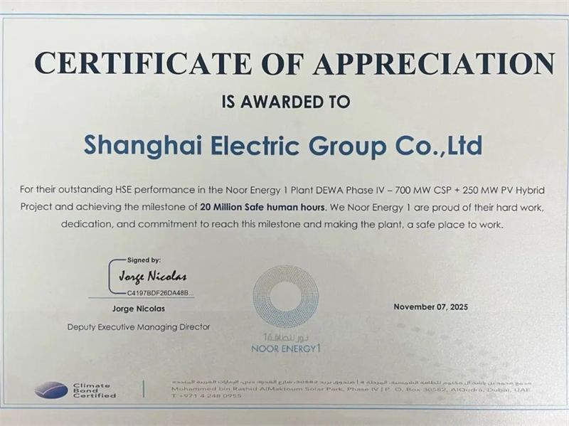 近日,迪拜光热项目2000万无损失安全人工时表彰仪式在项目现场举行,由业主方为项目部颁发荣誉证书。在各方协同努力下,项目顺利达成累计2000万无损失安全人工时,且连续1000余天未发生工时损失伤害事件。