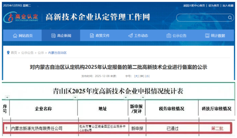 近日,太阳能光热联盟理事单位——内蒙古新源光热有限责任公司(简称:新源光热)成功通过2025年自治区高新技术企业认定。作为包头市青山区专注太阳能光热技术的国有企业,新源光热凭借强劲研发实力、突出技术创新成果及显著产业价值,斩获这一省级权威资质。