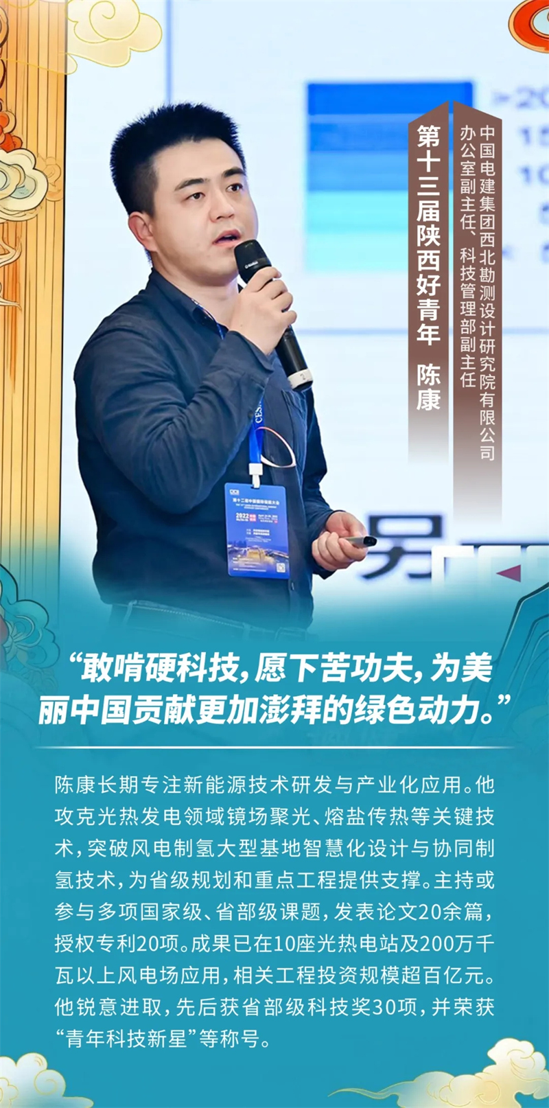 近日,共青团陕西省委联合中共陕西省委宣传部等相关部门共同开展的第十三届“‘中国梦·青年志’寻找身边的陕西好青年”宣传选树活动结果正式揭晓,经过推报、初选、复核展示、评审、会议研究及公示等环节,共评选出10位“陕西好青年”,太阳能光热联盟理事单位——中国电建集团西北勘测设计研究院(简称:中国电建)西北院办公室副主任、科技管理部副主任陈康喜获殊荣。
