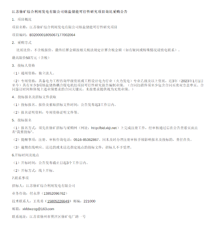 12月4日,江苏徐矿综合利用发电有限公司对外发布熔盐储能可行性研究项目询比采购公告,最高限价50万元(含税)。