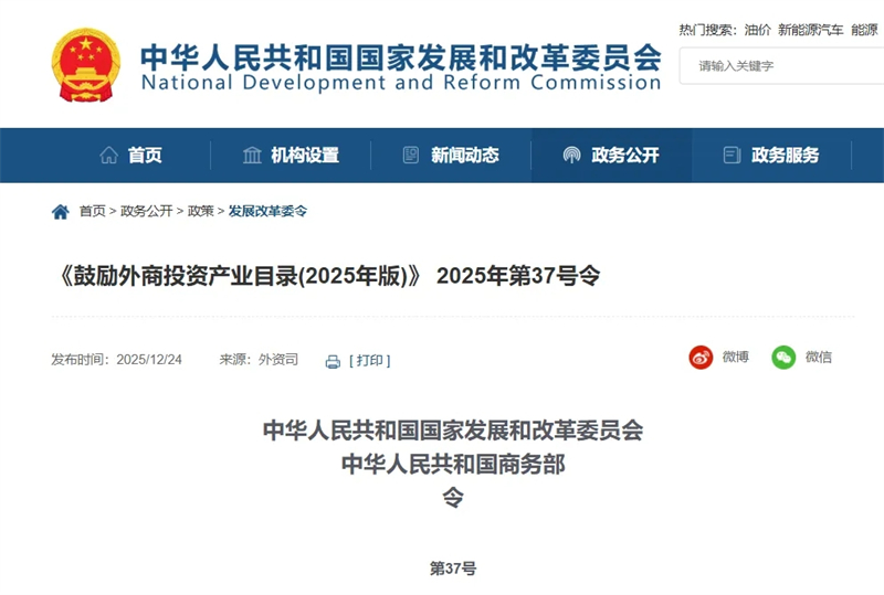 鼓励外商投资产业目录(2025年版)》已经国家发展和改革委员会第22次委务会议审议通过和商务部审签,经国务院同意,现予以发布,自2026年2月1日起施行。2022年10月26日国家发展改革委、商务部发布的《鼓励外商投资产业目录(2022年版)》同时废止。