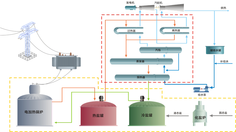 它的工作原理其实很直观,就像给能源装了个“蓄水池”:白天用光伏、风电等新能源发电,或利用电网谷电,将这些电能加热熔盐转化为热能,储存到高温储罐中;当需要用电、用汽或供暖时,再将高温熔盐泵送到换热器,释放的热能就能驱动发电机发电,或提供工业蒸汽、民生供暖。整个过程没有燃烧、没有排放,仅通过物理方式实现能量的储存与转换,让能量“慢半拍”,安全又环保。