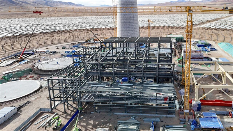 在主厂房里,工人们正加紧进行钢结构施工的收尾工作。站在工地的最高点远眺,雪域高原的壮丽风光尽收眼底。这片曾经只有风雪呼啸的旷野,如今正被上万片“太阳花瓣”温柔覆盖,它们将追随太阳的轨迹,将阳光的能量送入千家万户。