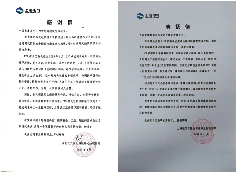 陈良军说:“目前通过全体攻坚克难,各项里程碑节点顺利实现,我们的努力也得到总包方和业主的一致表扬,期间收获了多封高度的表扬信,项目满意度调查>98分,至此,公司光热团队已完全具备全系统全过程塔式机组和槽式机组调试能力以及机组运维优化、性能提升、技术咨询的能力。”