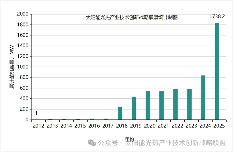 《蓝色书》显示,根据太阳能光热产业技术创新战略联盟统计,截至2025年底,我国光热发电累计装机容量达到1738.2MW(共27座、含首座200kW超临界二氧化碳光热发电基础研究实验系统),较2024年增长107%;其中,并网光热电站容量达到1720MW。