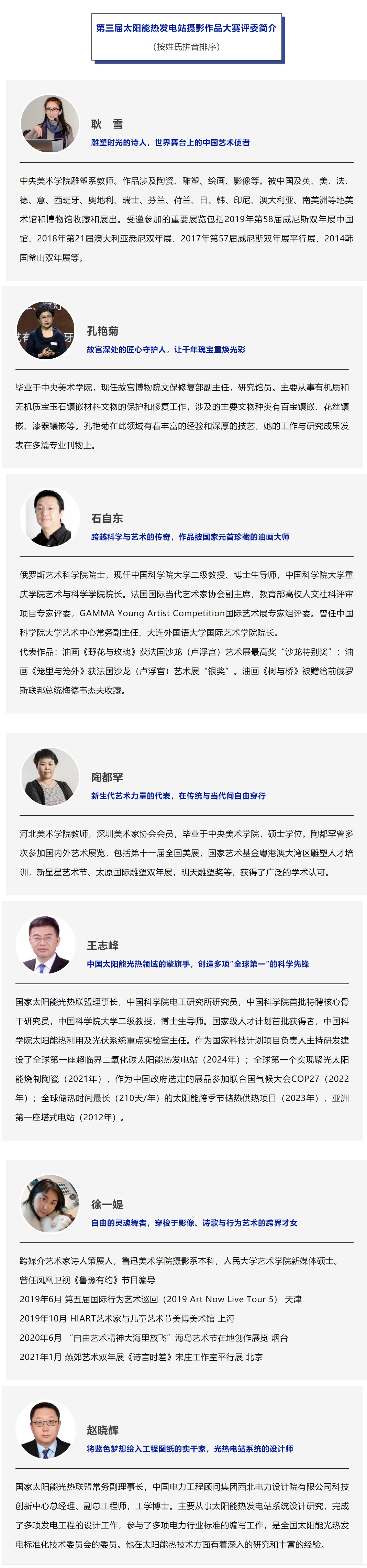 本届评委组由7名光热领域专家、艺术学者联袂组成(名单附后),具备深厚的行业背景与艺术评审经验,保障大赛评选的权威性与高水平。他们将以最独到的眼光、最深刻的理解,从每一幅投稿中,遴选那些最能触动心弦、展现光热之伟力与生态之诗意的杰作。