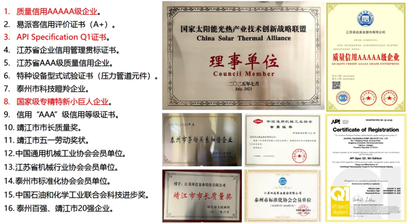 资质认证方面,双达泵业先后获评国家级专精特新“小巨人”企业、江苏省创新型企业,2022年9月成功在全国中小企业股份转让系统挂牌(股票简称:双达股份;股票代码:873805),凭借完善的管理体系通过美国API Q1质量管理体系、ISO9001质量管理体系等多项权威认证,产品通过美国API610、欧盟CE等国际认证,核心产品获中国节能认证。