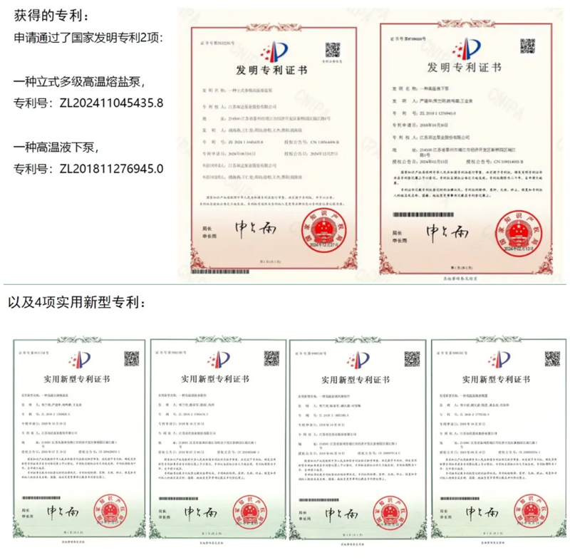 2025年7月,该产品通过中国通用机械工业协会技术鉴定,专家组一致认定其“主要技术指标达到国内同类产品先进水平”。产品通过优化水力模型、攻克高温材料难题等多重创新,解决了行业内普遍存在的熔盐泵吸入不稳定、热膨胀抱死、密封失效等痛点,相关技术累计获得国家发明专利2项及实用新型专利4项,成为企业荣誉矩阵的重要组成部分。