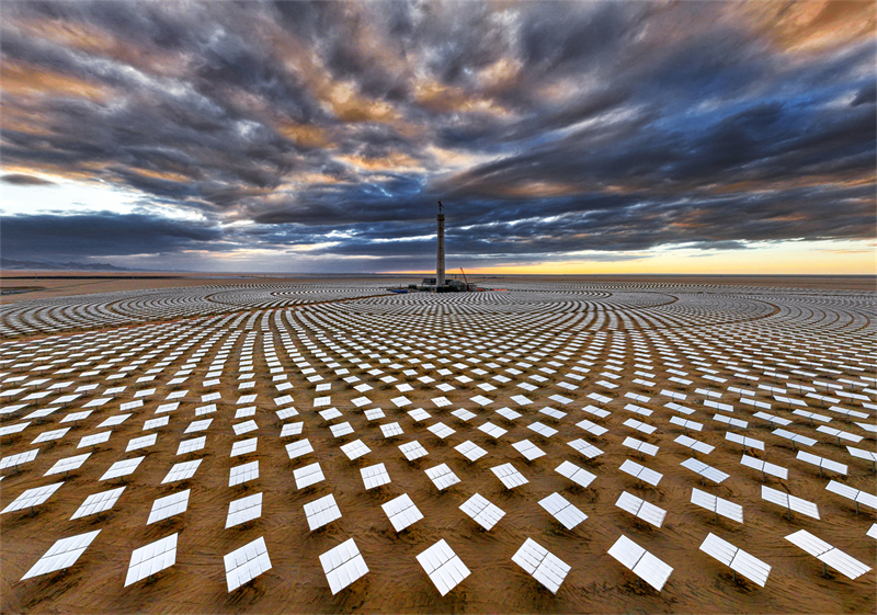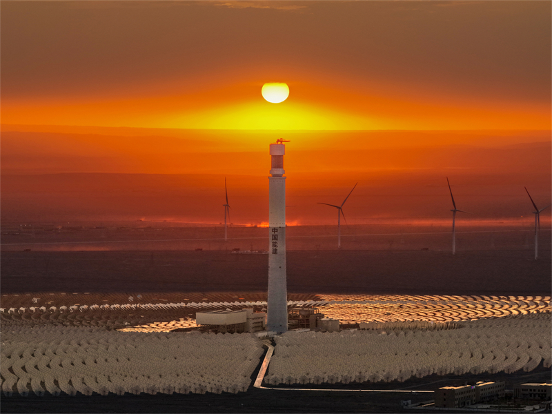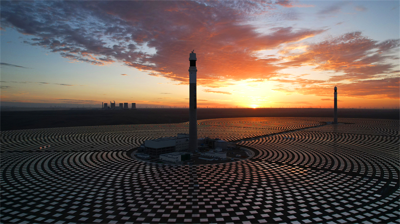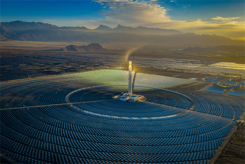 日出时分,朝阳如火球跃出地平线,为全球首座“双塔一机”光热储能电站披上霞光,点亮光热发电的序章。