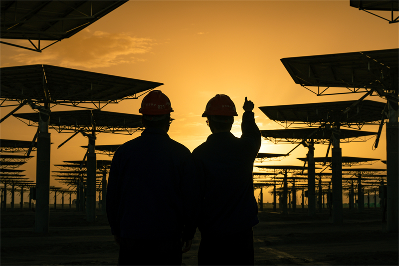 甘肃阿克塞110MW光热项目现场,照片中的是两位定日镜的调试人员,用高速快门记录下他们迎着朝阳走向新能源的剪影。