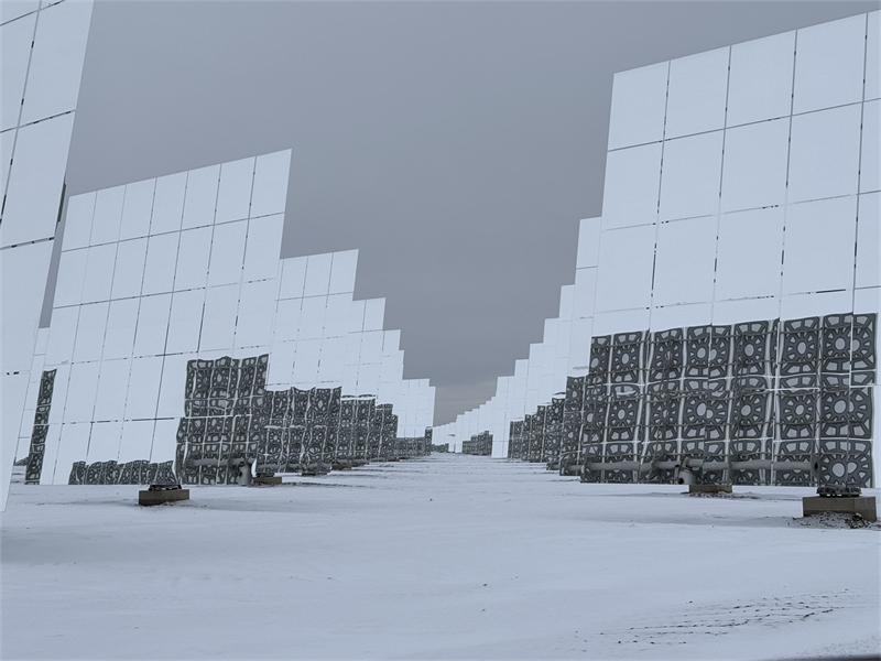 这幅摄影作品取景于敦煌首航节能新能源有限公司镜厂,定格雪后光热发电站的独特景致。覆雪矩形设施阶梯排布、搭配镂空设计,兼具视觉冲击力与科技感,既象征光热发电技术层层递进、精密高效,也借此展现清洁能源的无限潜力,凸显其在未来能源结构中的重要地位。