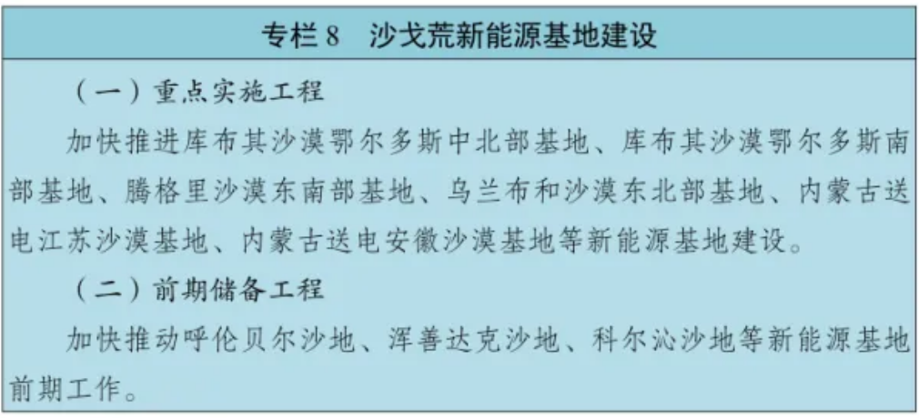 《纲要》明确,加快沙戈荒大型风电光伏基地建设,开展风能太阳能资源监测评估,科学制定年度利用率目标和开发规模,保持新增装机合理规模。加强分布式能源就近开发利用,因地制宜发展太阳能光热发电,稳步发展农林生物质、沼气能发电。到“十五五”末,新能源装机规模达到3.25亿千瓦。