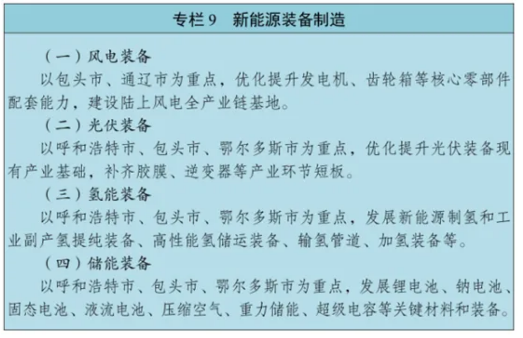 提升新能源装备制造产业能级。推进新能源产业关键材料、装备及零部件等全产业链发展,形成满足区内、供应周边、辐射全国的供给能力,建设国家级新能源装备制造基地。加快新能源重卡和无人电动矿卡规模化应用。培育新能源运维服务等关联配套产业,提升智能运维水平,打造“蒙西+蒙东”两个运维服务总部+多个区域运维服务中心的产业发展格局,推动综合能源服务与新兴用能场景深度耦合。