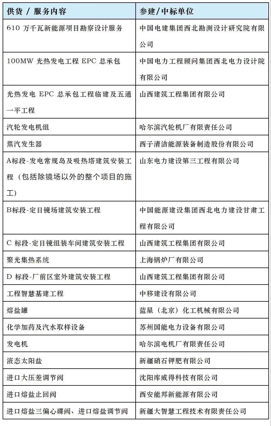 目前项目正有序推进中,中国能建西北院,中国电建西北院、山东电建三公司,西子洁能、上海锅炉厂、蓝星北化机等太阳能光热联盟理事单位参与项目建设与供货。该项目主要参建方与中标单位如表所示: