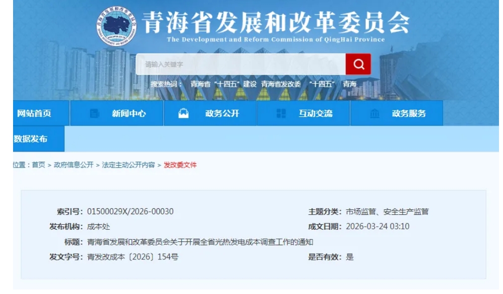 3月24日,青海省发展和改革委员会发布《关于开展全省光热发电成本调查工作的通知》。