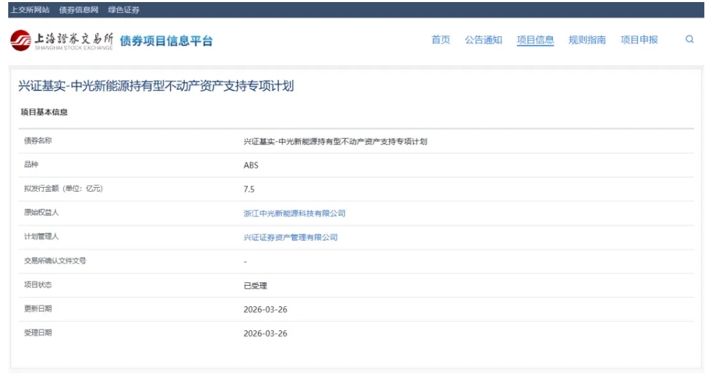 据上交所官网显示,兴证基实-中光新能源持有型不动产资产支持专项计划正式申报并获得受理。该项目原始权益人为太阳能光热联盟理事单位——浙江中光新能源科技有限公司(简称:中光新能源),计划管理人为兴证证券资产管理有限公司,拟发行金额为7.5亿元。
