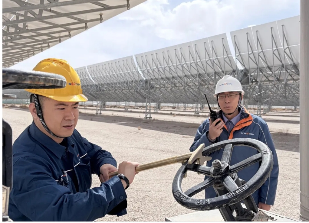 “不能让储罐成了‘热漏斗’!”杨涛迅速牵头组织成立党员攻坚队,带着队员们连续一周蹲守储罐区,记录温度变化曲线,并对比传统保温材料的导热系数。“这里的昼夜温差超过25℃,现有保温层无法应对这种变化。”根据记录数据,团队作出了初步判断。“把思路打开,既有材料不满足条件,那就看看其他领域。”经过多方对比反复研究,最终,团队结合光热电站系统特点,创新引进其他领域保温技术,推出“复合保温层+智能温控”方案,不仅成功实现伴热系统的智能调节,更有效降低了系统能耗。