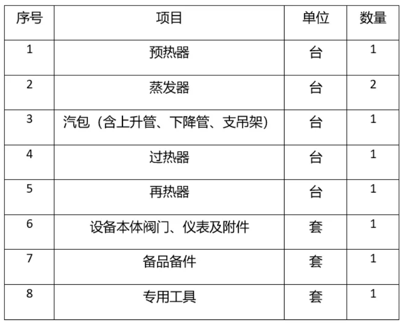 该项目蒸汽发生系统采用单列蒸汽发生器(1×100%),投标方保证提供设备为全新的、先进的、成熟的、完整的和安全可靠的,且设备的技术经济性能符合技术规范书的要求。包括但不限于如下内容: