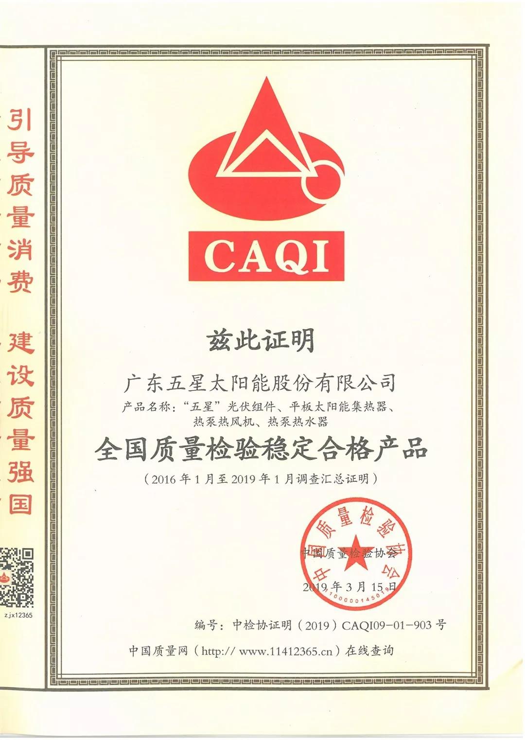近日,广东五星太阳能股份有限公司(简称五星太阳能)收到了中国质量检验协会寄来的相关荣誉证书,在中国质量检验协会主办的“2019年3•15产品和服务质量诚信承诺”主题活动中,五星太阳能凭借优质的产品和服务、较高的品牌信任度,分别荣获了“全国质量检验稳定合格产品”(2016年1月至2019年1月)、“全国太阳能行业质量领先企业”及“全国产品和服务质量诚信示范企业”等荣誉称号,彰显了五星太阳能坚守质量诚信,对消费者负责、对社会负责的良好企业形象。