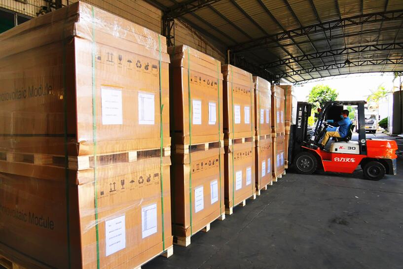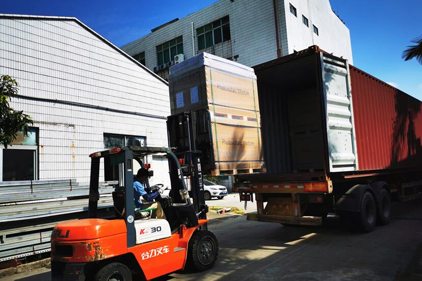 近日,阳光灿烂,点燃了夏天的火热。多辆货柜车有序进入广东五星太阳能公司(以下简称“五星”)厂区,又满载着光伏组件驶往港口,让五星组件远涉重洋。