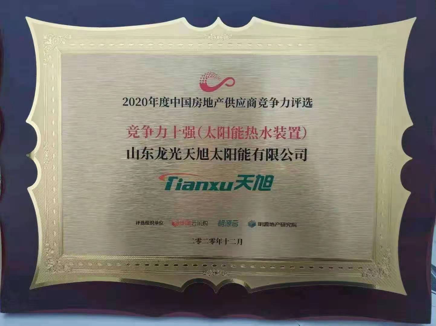 12月10-11日,2020中国房地产年度采购峰会暨第五届标杆开发商及优秀供应商颁奖盛典在上海举行,太阳能光热联盟理事单位——山东龙光天旭太阳能有限公司(简称龙光天旭)在众多企业中脱颖而出,被评为中国房地产供应商竞争力前十强(太阳能热水装置)。