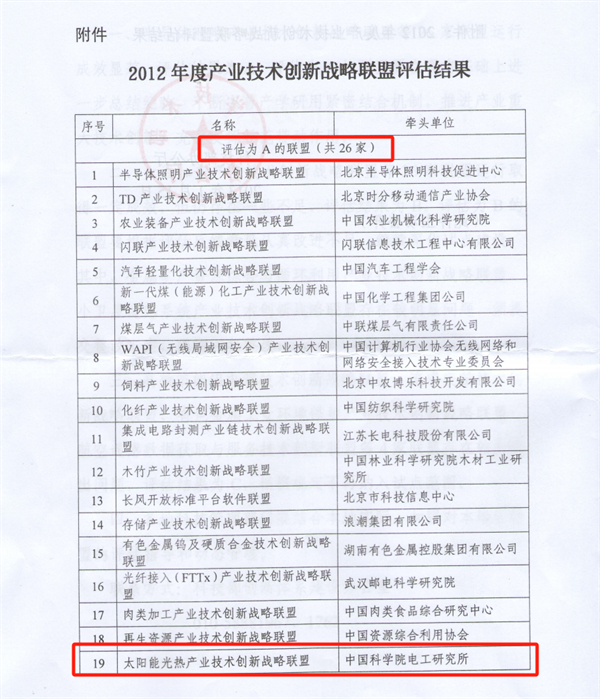 太阳能光热联盟于2010年列入科技部首批36 家试点联盟名单(国科办政〔2010〕3号)。2012年,在科技部2012年度产业技术创新战略联盟评估中获评为“A”类联盟(国科办体〔2013〕4号);根据科技部办公厅关于印发 《产业技术创新战咯联盟评估工作方案(试行)》的通知(国科办政〔2012〕47号),对评估结果为“A”的联盟,认定为“国家XXX产业技术创新战略联盟”。
