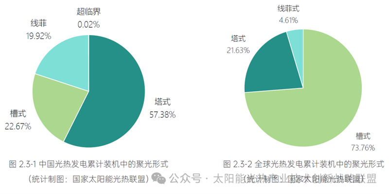 图:中国和全球光热发电累计装机中的聚光形式(来源:国家太阳能光热联盟等《中国太阳能热发电行业蓝皮书2024》)