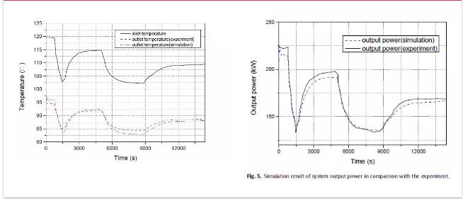 本文在dymola平台上搭建了太阳能ORC系统的动态仿真模型(如图1)。经与论文中实验数据比较,结果良好(图2)。模型中换热器基于分布参数法建立(如图3),槽式集热器(PTC)同样使用了分布参数法的动态模型(如图4)。模型的数学方程在本文中第2节部分进行了详细介绍。本文所用模型经打包形成了可用于常见热力学循环的仿真库TJU-thermo( http://www.solarsong.cn/archives/471),在本课题组网站上可进行下载(仅作为学术交流讨论,非商用)。