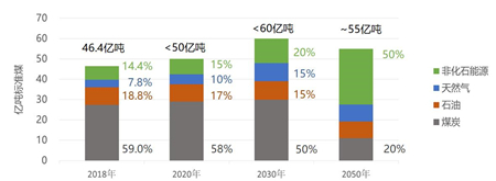 2018年全国能源消费总量46.4亿吨标煤,其中非化石能源消费占比14.3%。非化石能源在一次能源消费中的占比计划到2020年达到15%,2030年达到20%, 2050年达到50%。