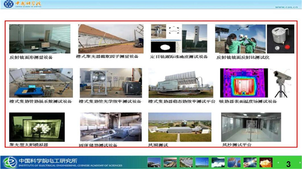 中国科学院电工研究所太阳能热发电设备检测中心(简称检测中心)是国家太阳能光热产业技术创新战略联盟授牌的首个太阳能热发电公共技术服务平台。检测中心主任宫博博士介绍说,自2016年2月正式纳入联盟公共技术服务平台以来,检测中心已经进行了太阳能热发电领域相关测试或检测服务100余项,检测设备资产价值8000余万元,拥有光学、控制、传热、机械等相关专业员工10余名。本文将对检测中心相关测试、检测能力和设备进行介绍。