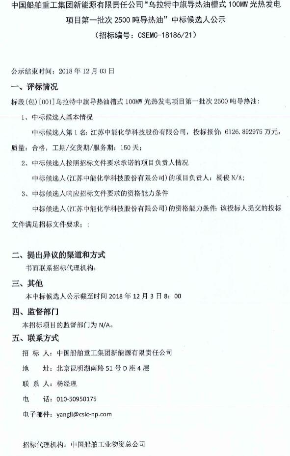 11月29日,乌拉特中旗100MW光热发电项目发布第一批次2500吨导热油中标候选人公示公告,江苏中能化学科技股份有限公司(简称中能科技)为该项目第一中标候选人。