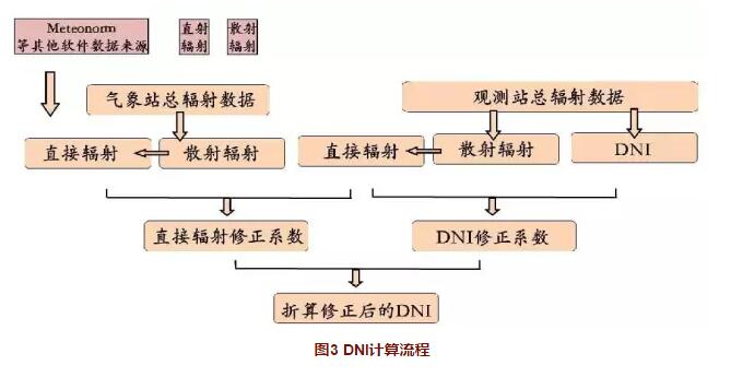 DNI是光热电站项目经济可行性研究的重要基础数据,对于任何一个光热电站,开发商要对自己和投资方负责,都必须在项目预选地安装测光站,进行至少一年以上的实际辐照数据搜集。依靠美国NASA的公开数据和我国各地气象站提供的数据资料并不足以指导光热电站的项目选址。DNI的计算方法及流程见图3所示。