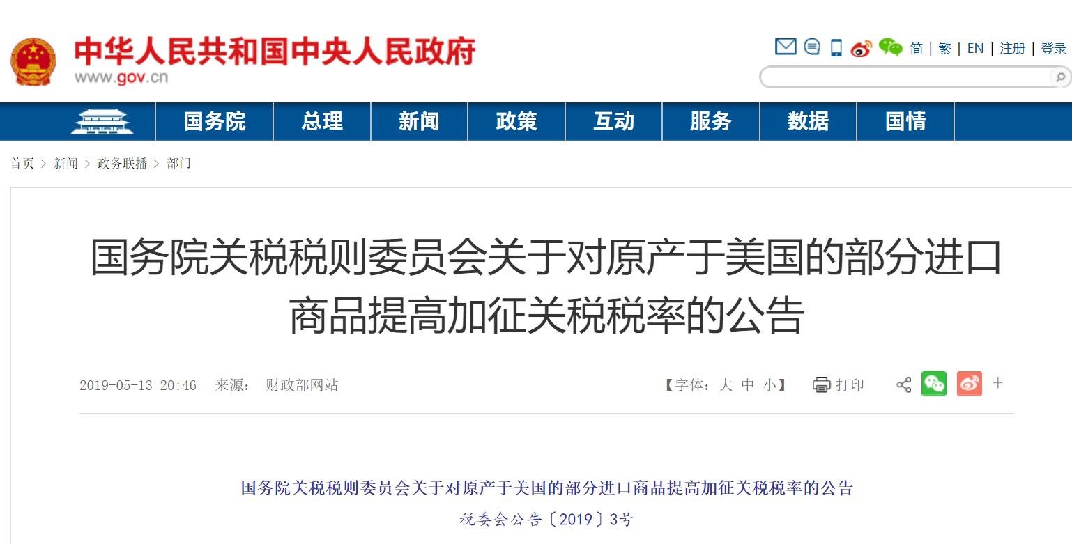 2019年5月9日,美国政府宣布,自2019年5月10日起,对从中国进口的2000亿美元清单商品加征的关税税率由10%提高到25%。美方上述措施导致中美经贸摩擦升级,违背中美双方通过磋商解决贸易分歧的共识,损害双方利益,不符合国际社会的普遍期待。为捍卫多边贸易体制,捍卫自身合法权益,中方不得不对原产于美国的部分进口商品调整加征关税措施。
